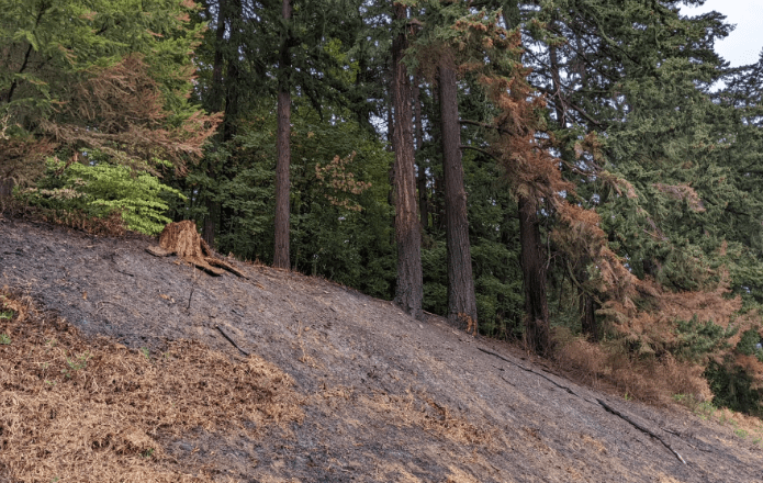 On the north side of Mt. Tabor, evidence of the a fire can be seen.